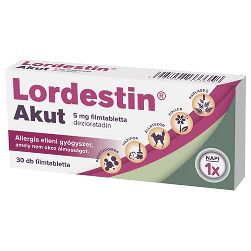 A Lordestin® Akut allergia elleni gyógyszer, mely nem okoz álmosságot.Csillapítja az allergiás nátha tüneteit felnőtteknél és 12 éves vagy ennél idősebb serdülőknél. Ezek közé a tünetek közé tartozik a tüsszögés, az orrfolyás és orrviszketés, a szájpad és a szem viszketése, a kötőhártya vérbősége és a könnyezés. A Lordestin® Akut a csalánkiütés tüneteinek enyhítésére is alkalmazható.